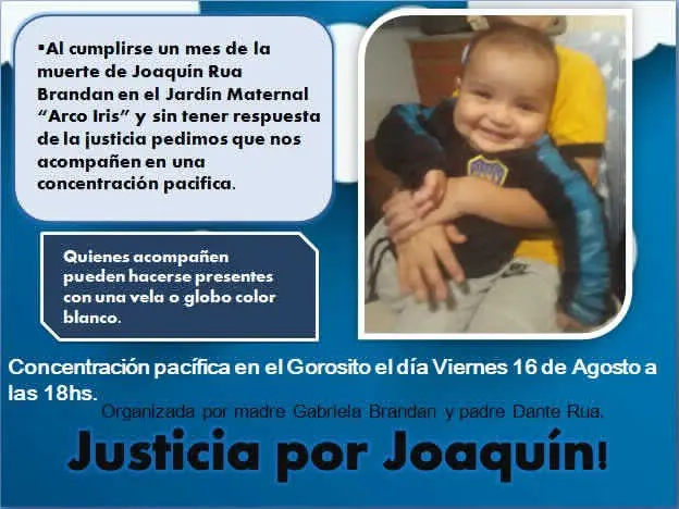 “Joaquín Rúa, de tan solo tres meses, era hijo de un sarmientino, falleció hace un mes en un maternal de Caleta Olivia. Sus padres piden Justicia por el y convocan a una marcha a través de las redes”, con ese breve mensaje, amigos y familiares de los padres del pequeño fallecido en aún inexplicables circunstancias en un jardín maternal de esta localidad, convocaron para salir a las calles el viernes y reclamar que se active la causa y se profundice la investigación.