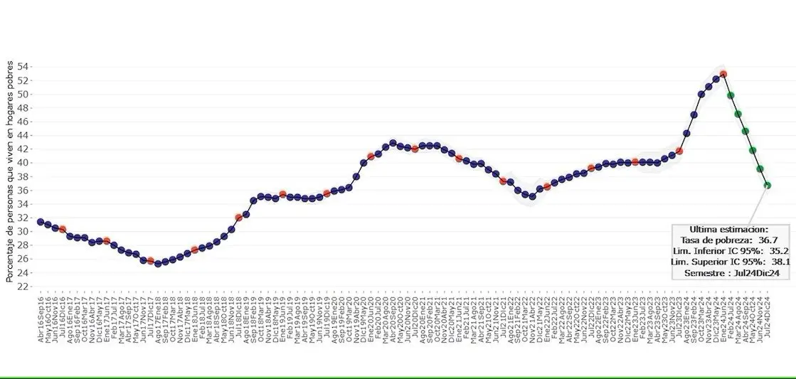 Esto implicaría una caída marcada respecto al 52,9% del primer semestre de 2024 y también en comparación interanual -segundo semestre de 2023-, que había registrado un 41,7 por ciento. Ese 36,8% surge del nowcast de pobreza elaborado por el economista de la UTDT Martín González Rozada, un seguimiento mensual de los indicadores sociales que suele ser citado por el presidente Javier Milei.